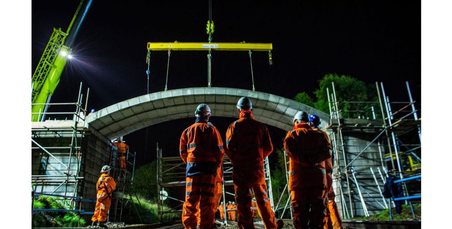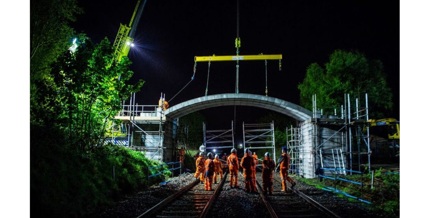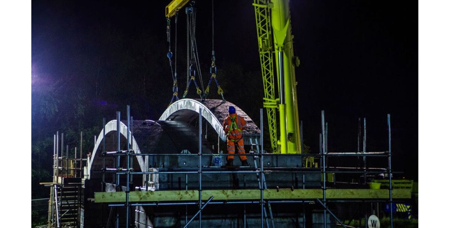 Precast units were then craned into position during the rail possessions using a 200T mobile crane. When completed, the FlexiArch units formed a segemental arch profile with a span of 11m and a rise of approximately 1.4m. The main bridge arch structure, spandrel walls and parapets were completed within two 7-hour possessions. Concrete approach ramps and containment barriers were then installed before the application of a non-slip surfacing.
