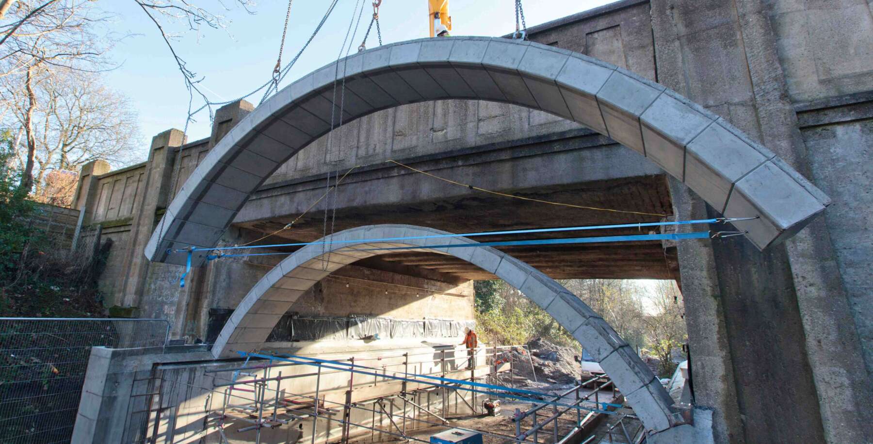 The system is built from precast concrete voussoirs (tapered blocks), each manufactured with the correct taper for the required span and rise. These blocks are linked with a flexible polymeric membrane, allowing the arch to naturally form into its correct load-bearing shape when lifted into place by crane.