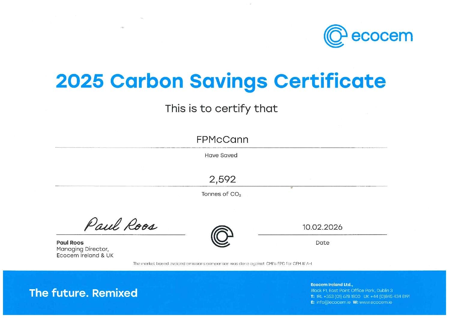 FP McCann Awarded 2025 Carbon Savings Certificate from Ecocem