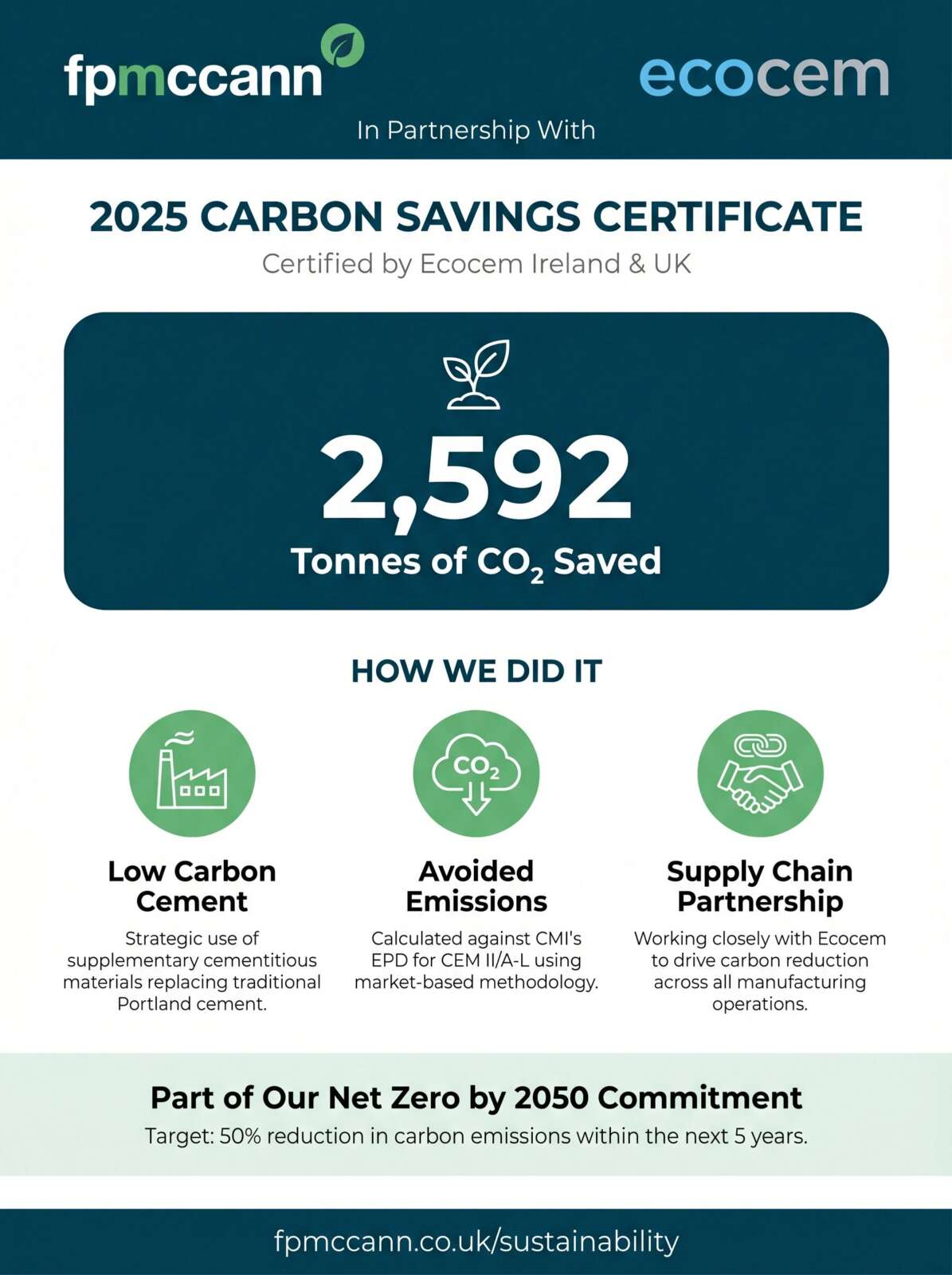 As part of our ongoing commitment to environmental responsibility and our pledge to achieve Net Zero by 2050, we continually seek innovative ways to lower the carbon footprint of our products. This certification confirms that through our strategic procurement and use of low-carbon cement alternatives, FP McCann has successfully saved 2,592 tonnes of CO₂.