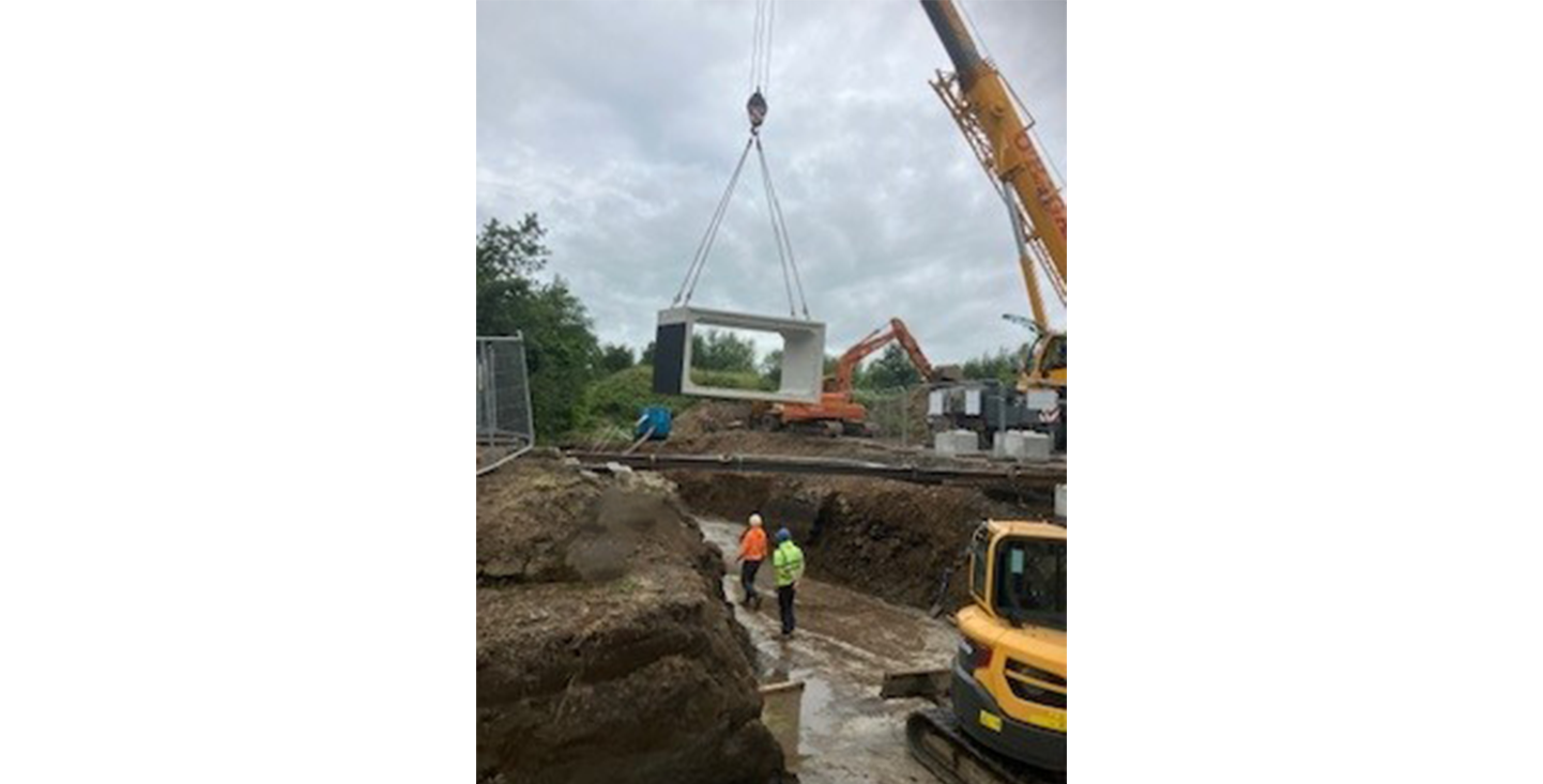 A total of 18 precast units weighing in at around 180T were installed in 1 day allowing the remaining works to proceed at pace. All box culverts were bespoke to suit the skew of the existing watercourse and aligning the road with the edge of the parapets. All precast units were manufactured at our Macrete depot
