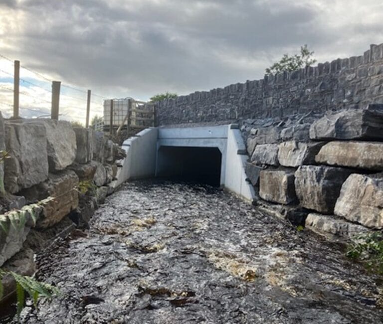 FP McCann’s Ennis Stone was used to complement the surrounding area with its use in the masonry parapets. FP McCann’s primary rock armour was also used within the watercourse as scour protection to the embankments.