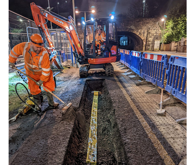 The works involved the installation of 75m of buried multi duct and anti-tamper surface trough sections and 2no. 1200mm x 1200mm Glass Reinforced Plastic (GRP) access chambers with lockable concrete infill lids within the cess and UP platform followed by platform bituminous surfacing and thermoplastic line marking reinstatements and finally the insitu concrete extension of the platform to cess Permanent Way (P-Way) access ramp. With excavations being required to be undertaken alongside live and critical rail signal and telecommunication cable infrastructure (later found to be partially un-ducted), as well as alongside the foundations of the adjacent masonry arch rail over bridge, for this project FP McCann employed the use of a vacuum excavator operated in conjunction with a Road/Rail Excavator (RRV) to complete the excavations safely whilst reducing the risk of service strikes, injury to operatives and possible impact to the rail infrastructure and operations.