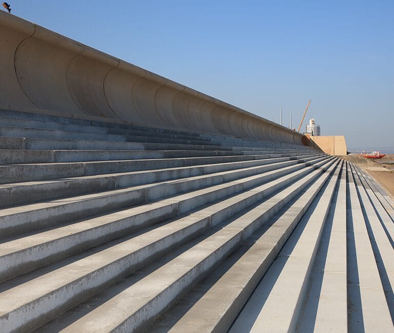 Products Supplied: Precast Concrete Stepped Revetment Units; Wave Walls; Coloured Precast Concrete Steps; 6m High Precast Concrete Walls and Flood Defence Walls