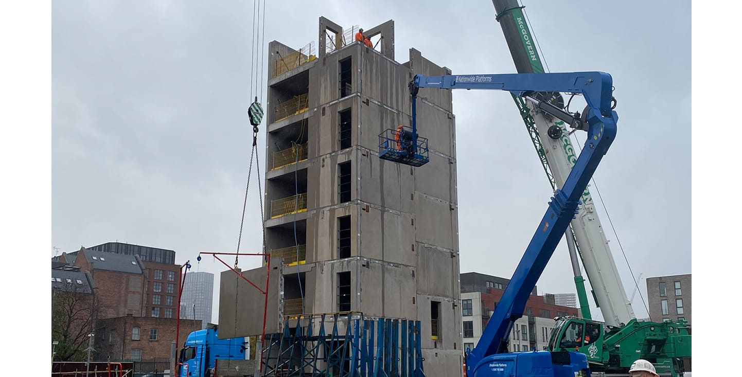 Main contractor on the project Bowmer + Kirkland along with architects Buttress and structural engineers Kennedy Redford engaged and involved FP McCann at the early stages of design. FP McCann were able to demonstrate fast-track construction of the structural off-site manufactured precast concrete elements thereby allowing follow-on trades easier and safer access. Within the design criteria, the structural cores have a type B finish and a 120-minute fire rating to comply with MSCP standards. In total, 2340 tonnes of precast concrete panel sections have been supplied and installed by FP McCann.