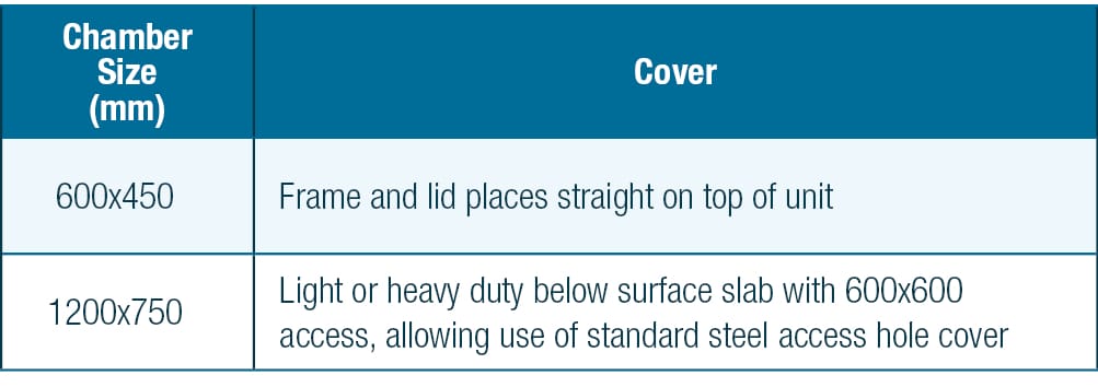 To complete the chamber, FP McCann has a range of covers and ground level components. FP McCann’s frame (also known as a surround) and lid combination is designed to sit flush with the top course, such as tarmac or concrete surfacing or in grassy areas.